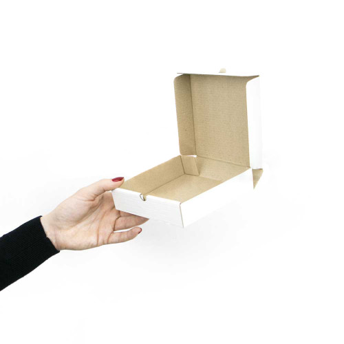 Картонна коробка 130 (d) x 130 (sh) x 30 (c) білого мікро -фрі -найменший у нашому асортименті. Ця скринька зібрана з одного аркуша гофрованого картону без використання додаткових засобів для кріплення (клей або клейова стрічка). Коробка підходить для упаковки продуктів харчової промисловості або будь -яких інших дрібних предметів.